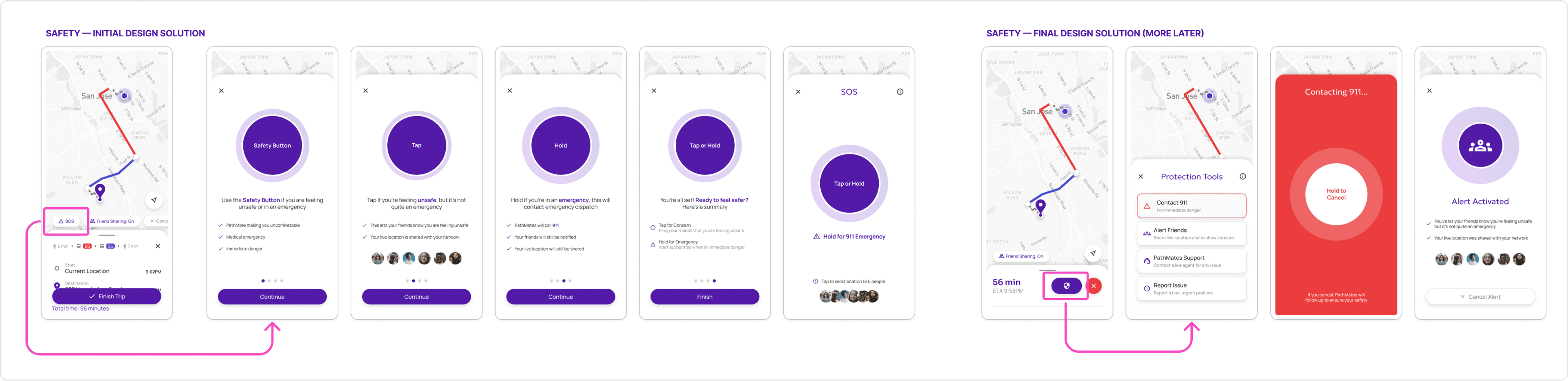 Initially, I tested an SOS Button with an onboarding process. But through testing and feedback, I realized it was unruly and overcomplicated. Instead, I opted for a concise safety menu where users could easily see their options laid out.